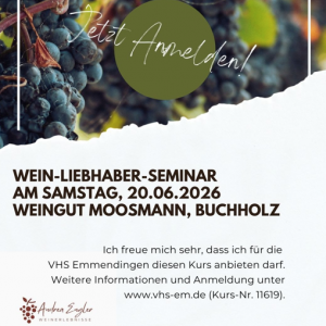 mit Kellerführung und Weinprobe im Rebberg Begrüßungssekt im Weingut Moosmann in Buchholz und anschließender Kellerführung mit einem Wein zum Probieren. Danach Spaziergang zum Rebberg Sonnhalde mit einem Rundgang und einer dreier Weinprobe an verschiedenen Stationen im Rebberg unter fachkundiger Leitung. Jeder Teilnehmer erhält eine Vespertüte (nicht vegan) beim Rundgang. Abschluss beim Weingut Moosmann mit einem […]