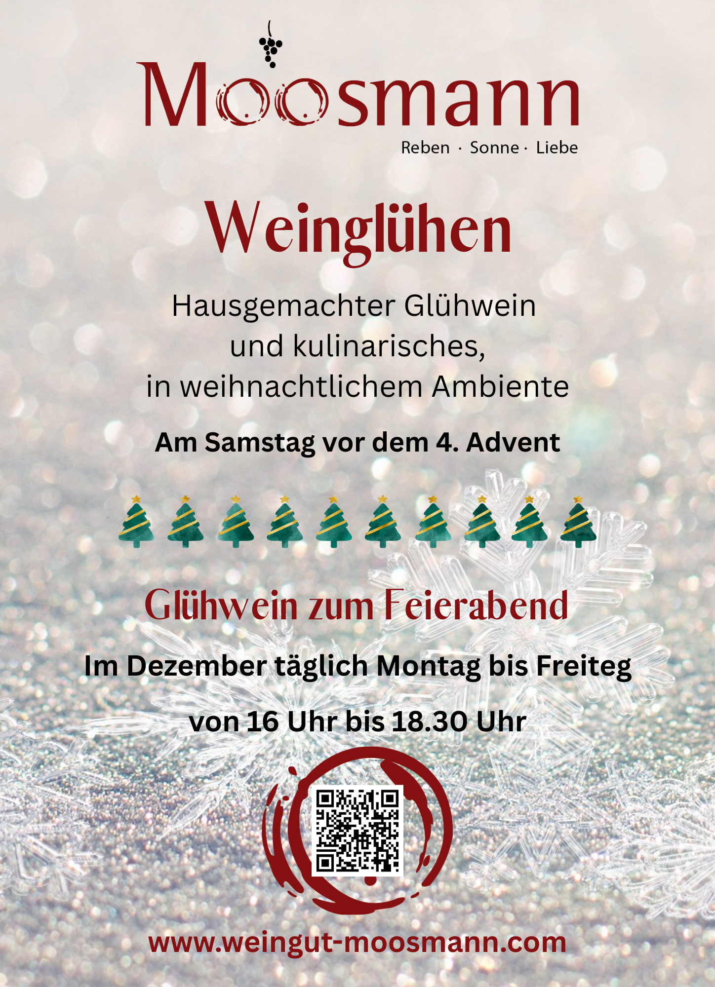 Ab 17 Uhr ist unser Innenhof stimmungsvoll beleuchtet. Bei Glühweinduft und Kerzenschimmer bieten wir Glühweine und Herzhaftes. Einfach vorbeikommen und genießen.